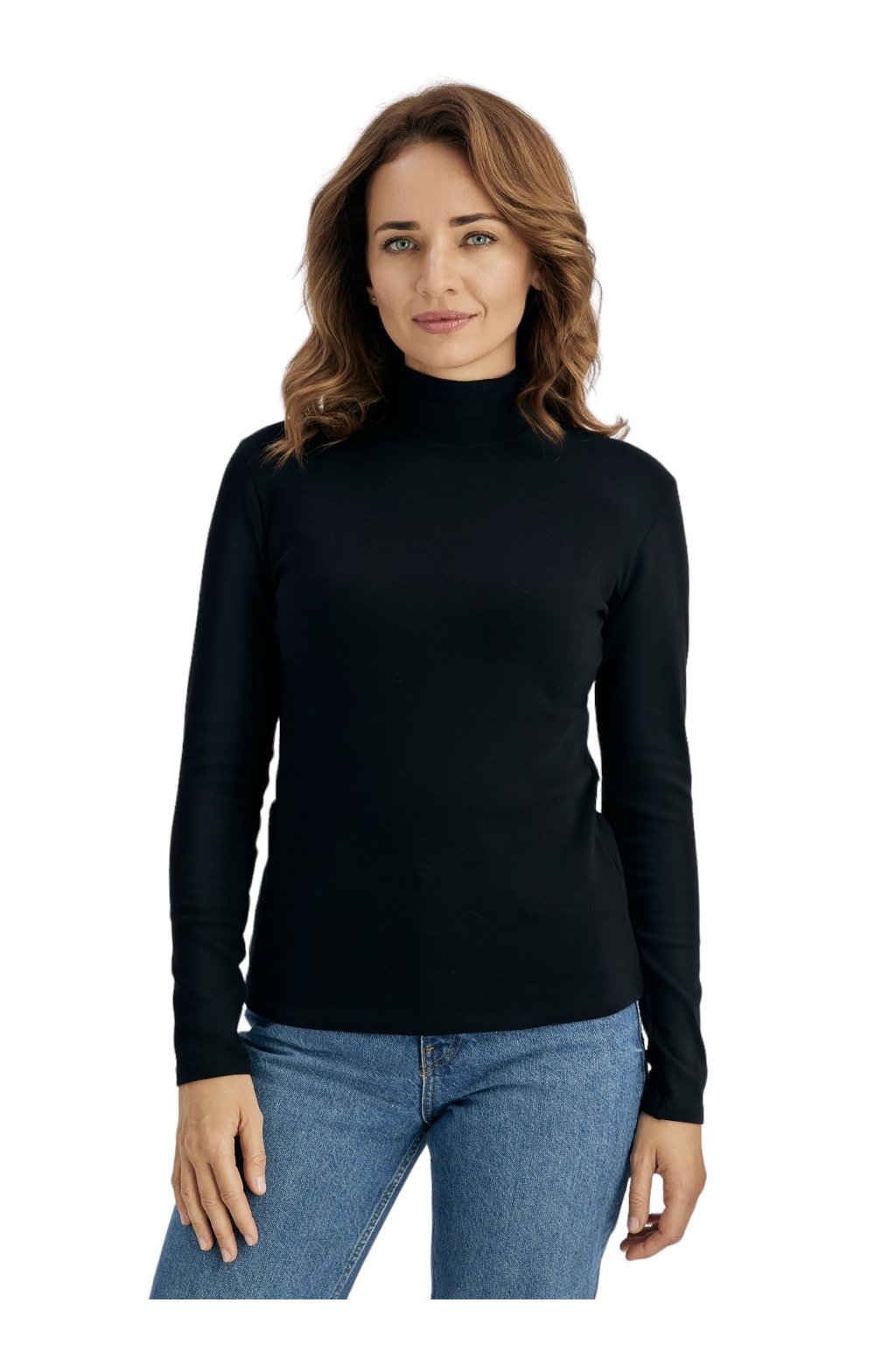 Černá dámská halenka Wadima 10329 z hladkého materiálu, s roláčkem a dlouhými rukávy, 94% viskóza a 6% elastan.