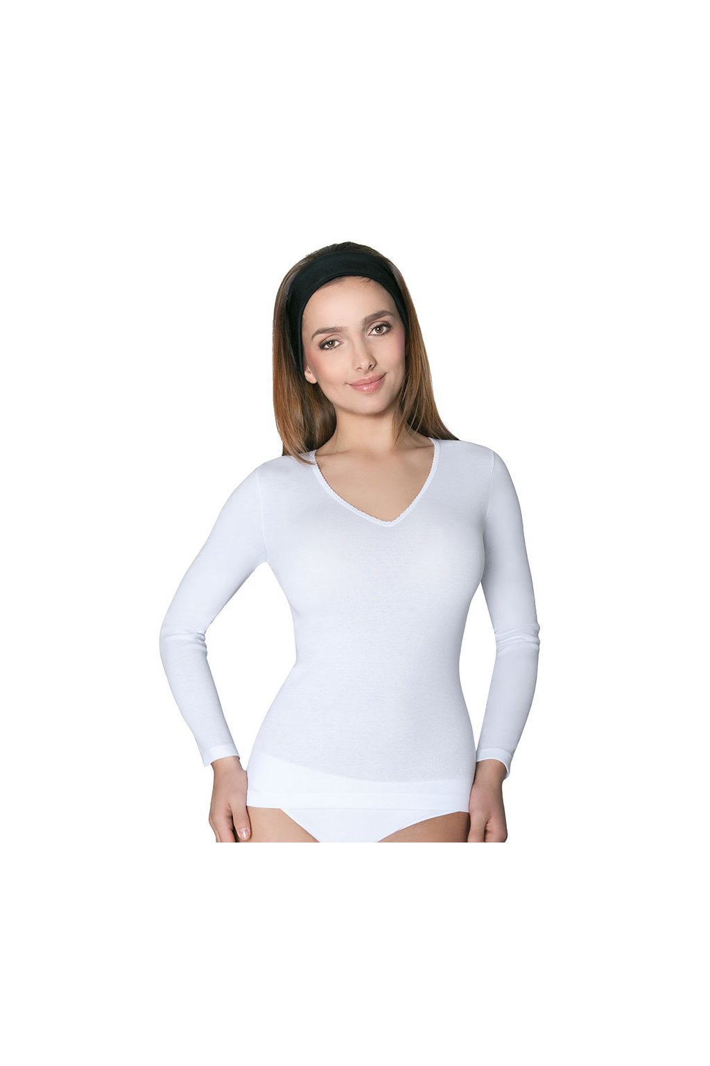 Dámská bílá košilka Wadima 10214 s dlouhými rukávy a kulatým výstřihem, z hladkého materiálu, 100% bavlna.
