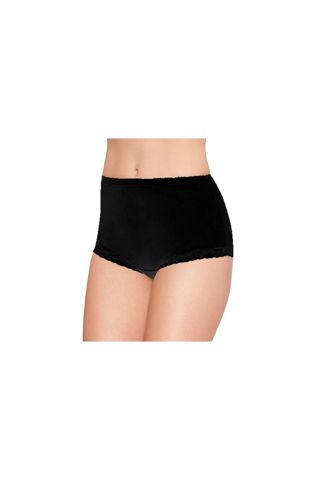Dámské černé kalhotky Wadima 100ROKSANA vyššího střihu s krajkou po obvodu nohaviček. Vyrobeny z 94% bavlny a 6% elastanu.