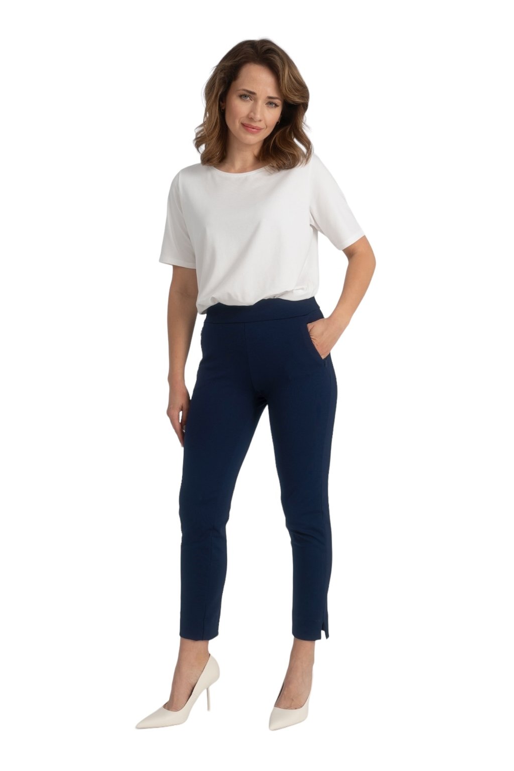 Dámské kalhoty 7/8 délky Wadima 10124. Mírně elastické kalhoty mají vysoký pas s 5 cm širokou všitou gumou pro větší pohodlí a perfektní tvarování postavy. Do bočních kapes jsou všity kryté zipy. Nohavice jsou mírně zúžené. Vyrobeno z kombinace jemné přírodní viskózy, polyamidu a elastanu. Lze nosit k mnoha příležitostem.