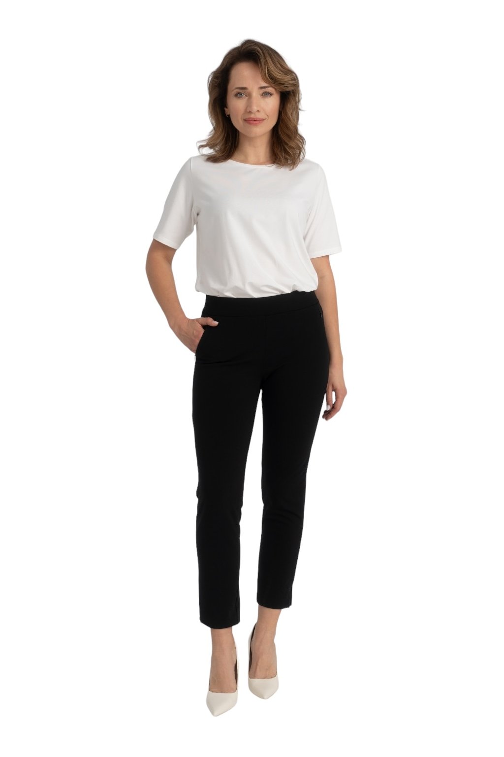 Dámské kalhoty 7/8 délky Wadima 10124. Mírně elastické kalhoty mají vysoký pas s 5 cm širokou všitou gumou pro větší pohodlí a perfektní tvarování postavy. Do bočních kapes jsou všity kryté zipy. Nohavice jsou mírně zúžené. Vyrobeno z kombinace jemné přírodní viskózy, polyamidu a elastanu. Lze nosit k mnoha příležitostem.