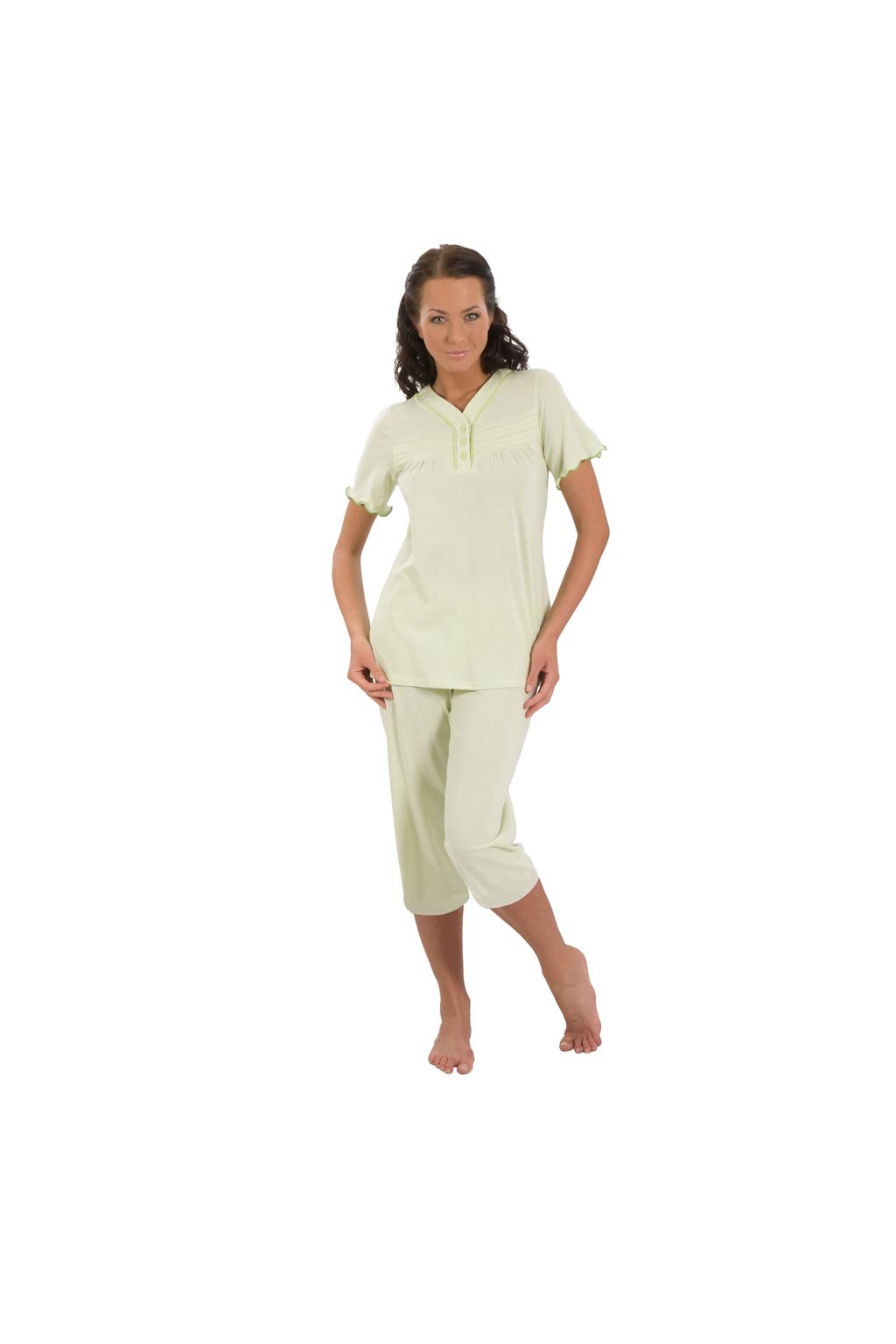 Dámské zelené pyžamo Wadima 104145 s krátkými rukávy a 3/4 nohavicemi. Výstřih do V a na knoflíčky, propracované detaily, vyrobeno ze 100% bavlny.