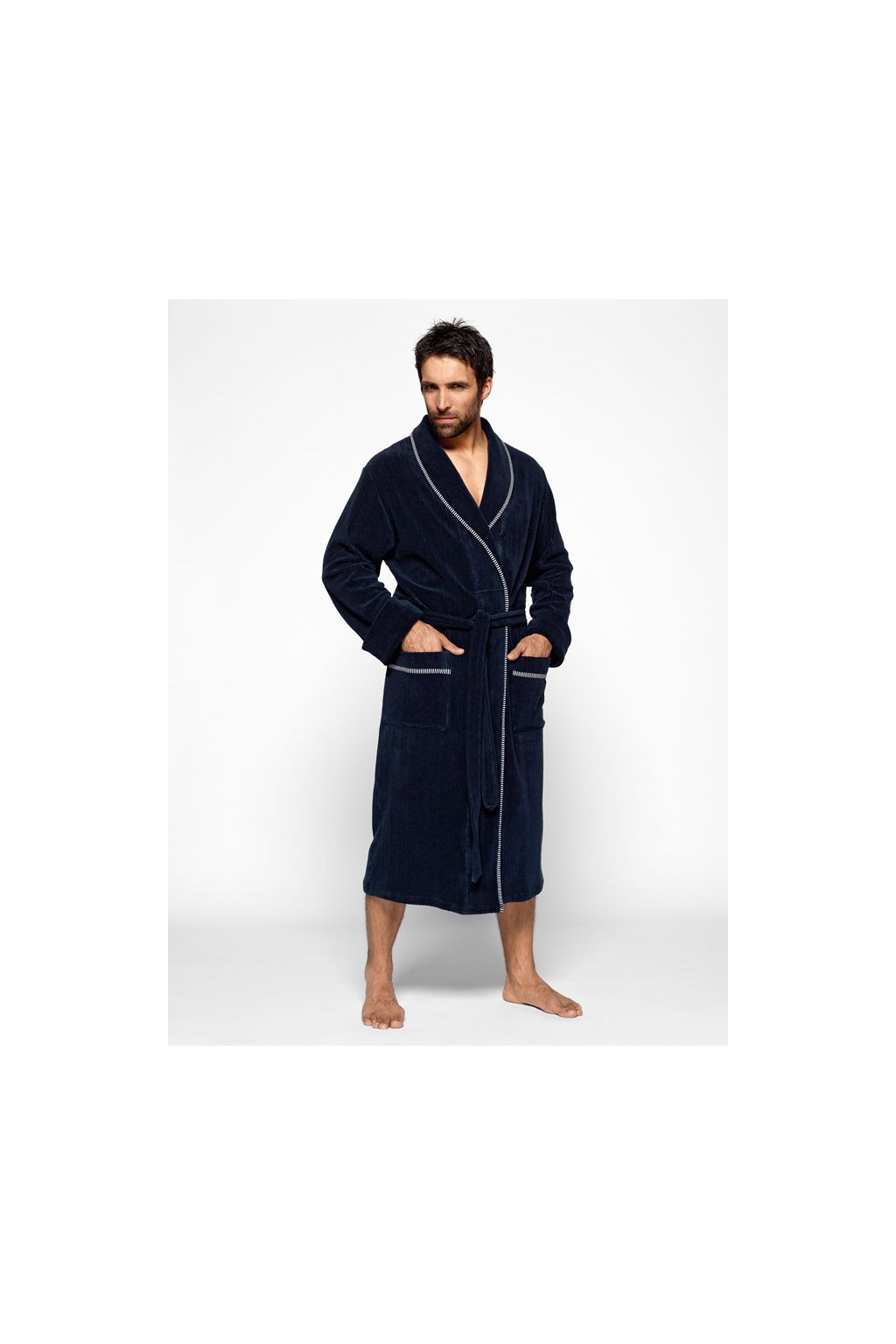 Pánský modrý župan Wadima 20455 z froté materiálu s dlouhými rukávy. Límec a kapsy jsou lemovány prošitím, pásek v barvě modré. Materiál z 80% bavlny a 20% polyesteru.